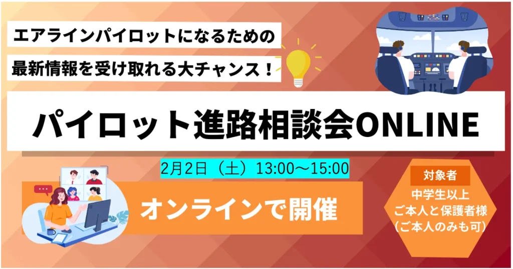 2月2日(日)13:00〜、オンラインにて自社養成志望者と私大操縦進学希望者を対象とした、「パイロット進路説明会オンライン」を開催いたします!(Zoomを使用します) パイロットを目指し始めた方向けに、パイロットになるに … 続きを読む 2/2 パイロット進路説明会オンライン開催のお知らせ