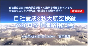 4/6(日)13:00〜、オンラインにて自社養成志望者と私大操縦進学希望者を対象とした、「パイロット進路説明会オンライン」を開催いたします!(Zoomを使用します)