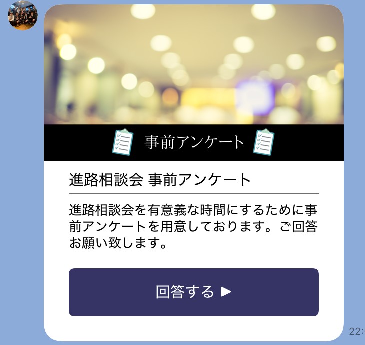 進路相談会を有意義な時間にするため、メッセージの後にございます事前アンケートの回答をお願い致します。