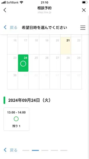メッセージの後にございます相談フォームに必要事項の入力をお願い致します。送信した時点で、予約は確定となります。